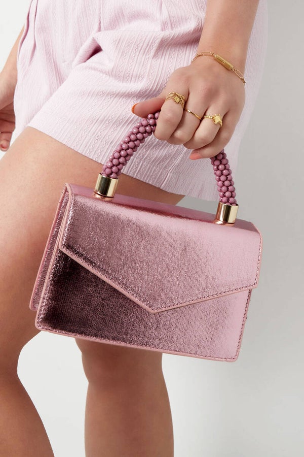 Metallic roze envelop tas met een funky snoepachtige handvat.