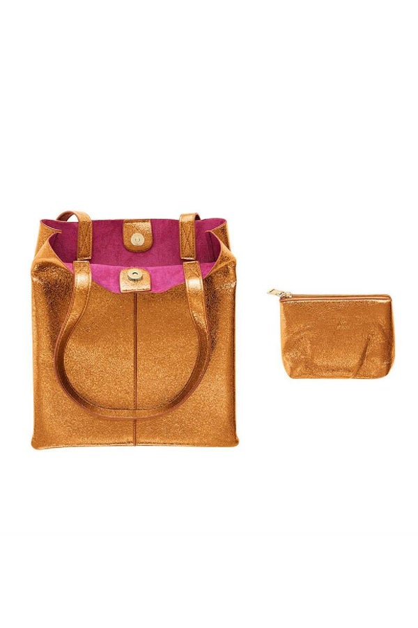 De metallic shopper is gemaakt van 50% PU en 50% polyester.