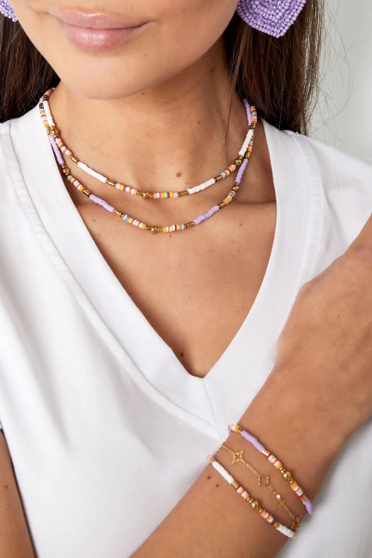 Van deze prachtige kleurrijke ketting wordt je toch meteen vrolijk! Deze multi kleur ketting met turquoise is perfect te combineren met meerdere gouden kettinkjes. Deze ketting is gemaakt van Stainless Steel, hematiet en polymeerklei. De ketting is verstelbaar vanaf 38 t/m 43 cm.